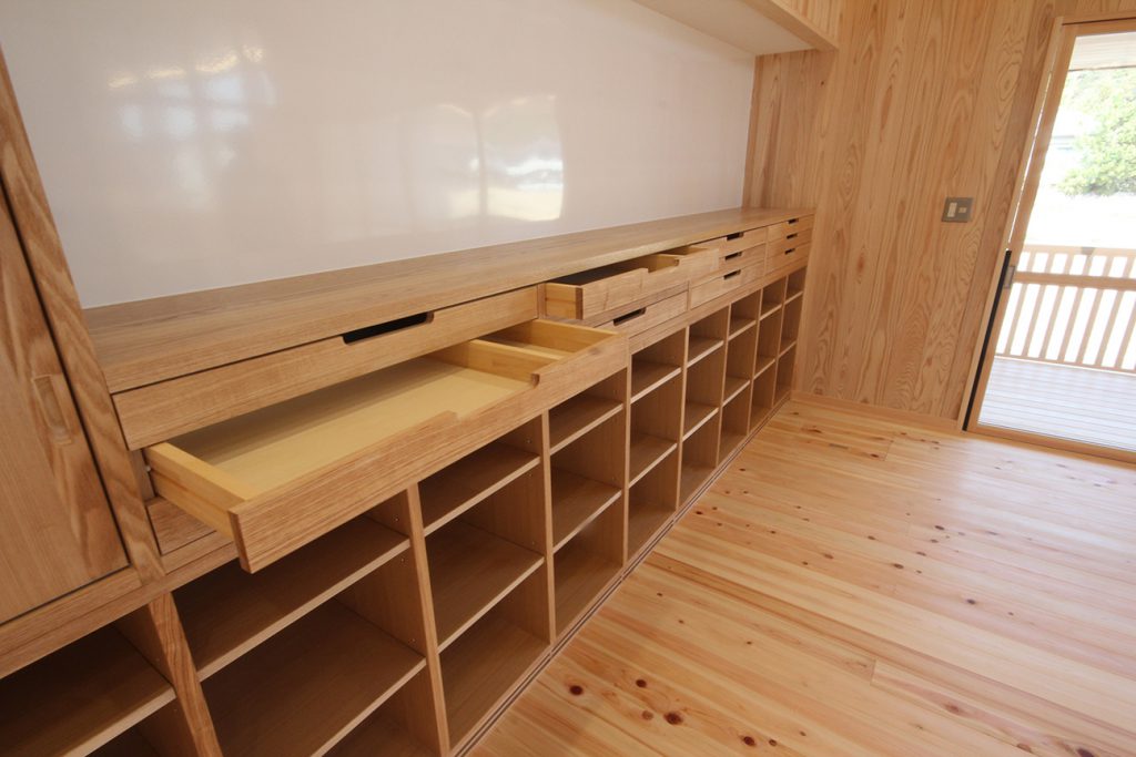 | 外部仕上 | 構造材/柱・梁:杉材・桧材 含水率20%以下(静岡県産材) 屋根/ガルバリウム鋼板縦ヒラ葺き 軒天/木毛セメント板TSボード15㎜、杉Jパネル貼り30㎜ 外壁/ガルバリウム鋼板貼、漆喰コテ押さえ仕上げ、杉赤本実板縦貼 外部建具/木製オリジナル建具 桧、ペアガラス アルミサッシ(ペアガラス) |