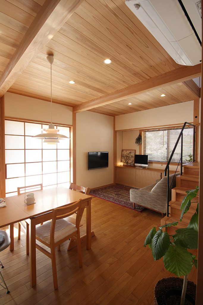 今回ご紹介する掛川市のIさんのお宅は、元々ご実家の離れが建っていた場所に新築しました。Iさんのお宅は、ご夫婦+お子さん2人の4人暮らし。お隣に暮らすご両親のお宅も大きく立派なので、コンパクトに暮らす小さな住まいを計画しました。1階には、+αのスペースを持つ広間と水回りを配置し、2階には寝室、子供室、クローゼットを配置しました。延床面積30坪弱とコンパクトではありますが、1階は空間をワンルームにまとめ、大きな屋根付きのデッキを取り込んだ間取りとなりました。デッキには深い軒を設け、室内が暗くならないように軒先まで伸びるガラス屋根としました。屋根付きデッキは雨の日も使えて便利。加えてガラス屋根は暖かな日差しを室内に運び、一年を通して重宝するスペースになりました。