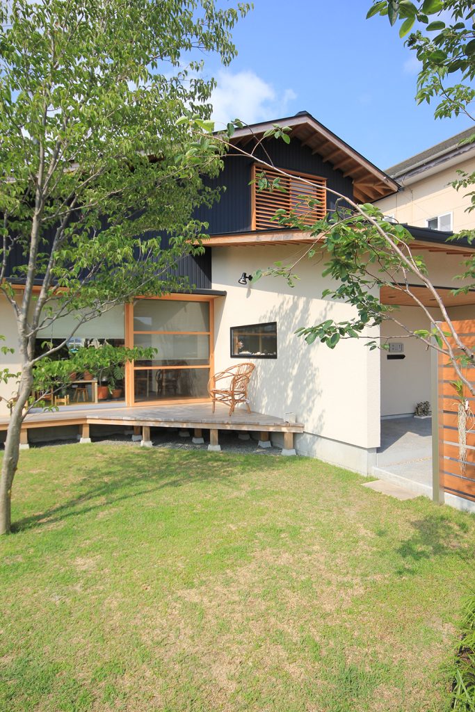 Uさんのお宅は、東側の住宅以外は遮るものが少ない開放的な敷地でしたが、将来の周囲環境の変化を想定しつつ、Uさんのご要望をプラスした、南側と北側に2つの庭のあるT型配置のプランを提案しました。