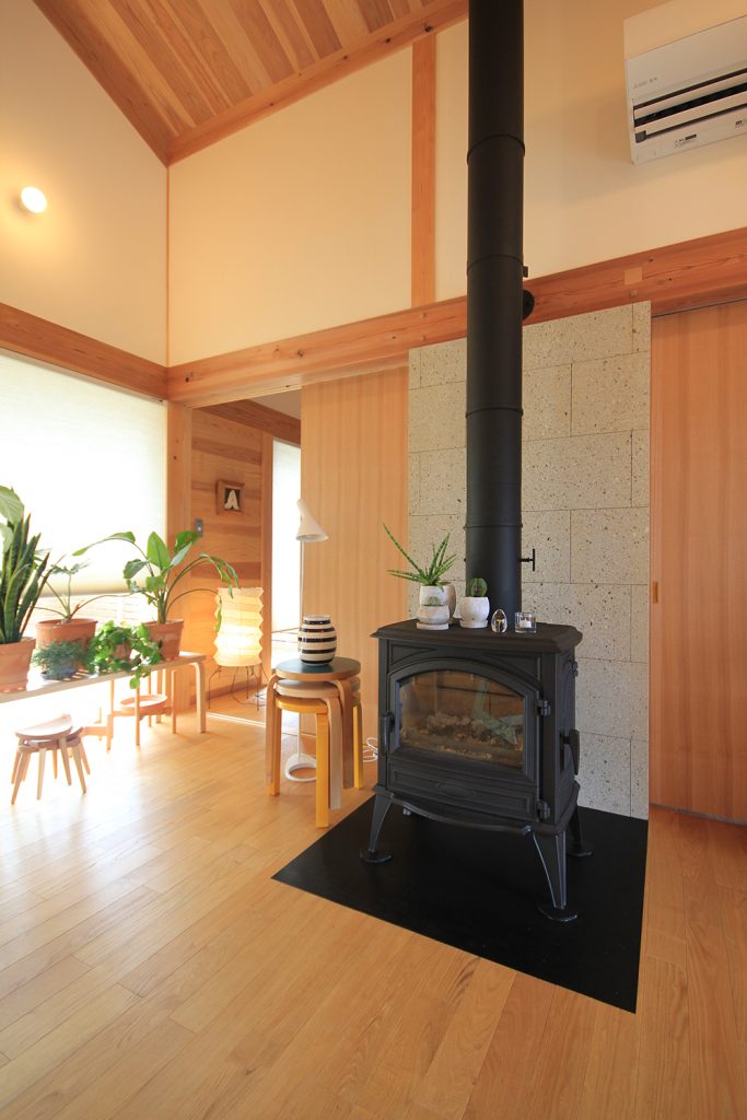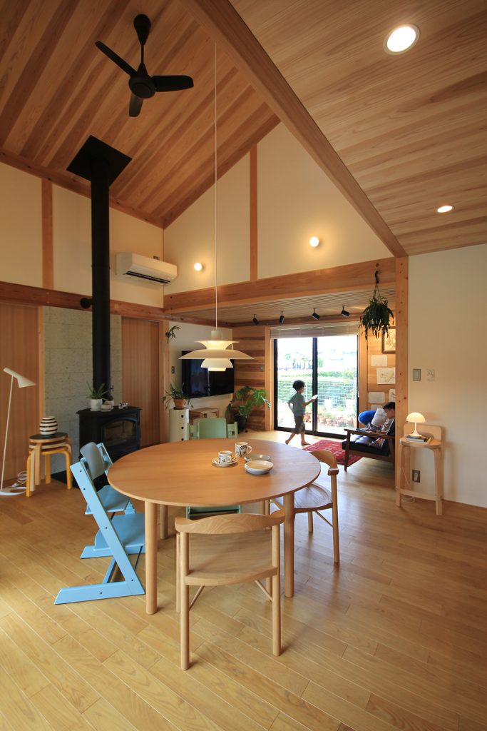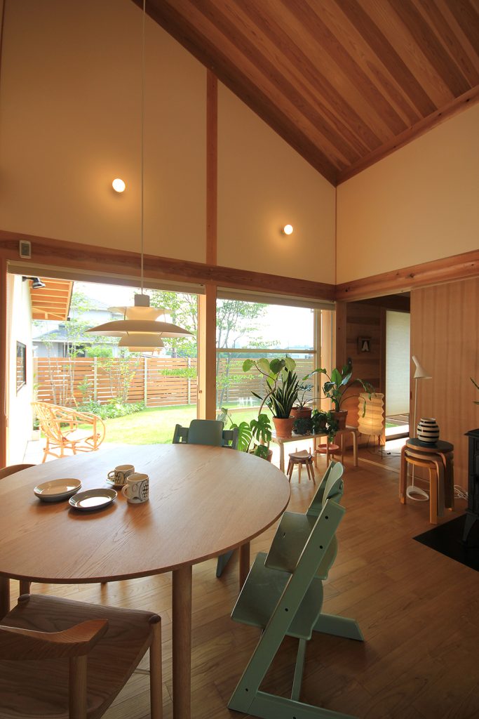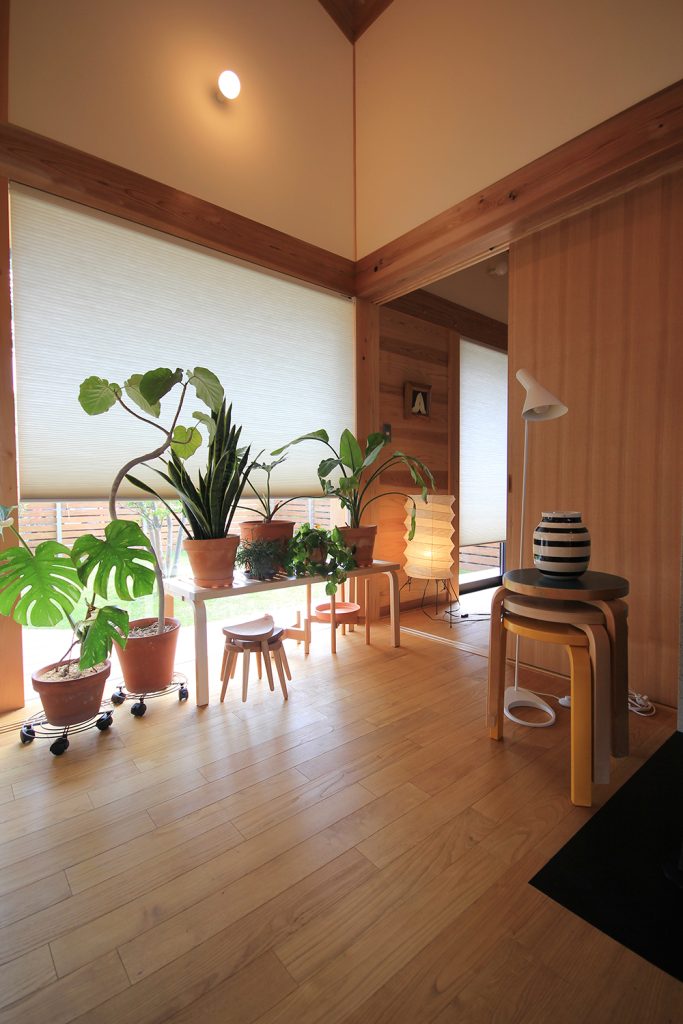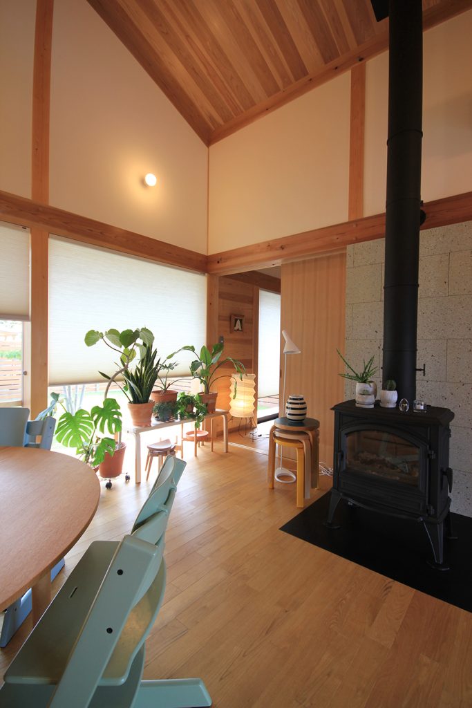 内部は、なるべく平屋で暮らせる間取りを優先的に考え、現在の4人生活を考えつつも、将来の夫婦2人生活を想定し必要なスペースを考えていきました。家族の集まる広間スペースを建物中心に、南と北の庭のどちらにもつながる窓を設けました。南の窓は家の中からもデッキを通じて植栽が楽しめます。北の窓は、薪を運んだり、家庭菜園へ出入りなど生活動線を重視してしました。