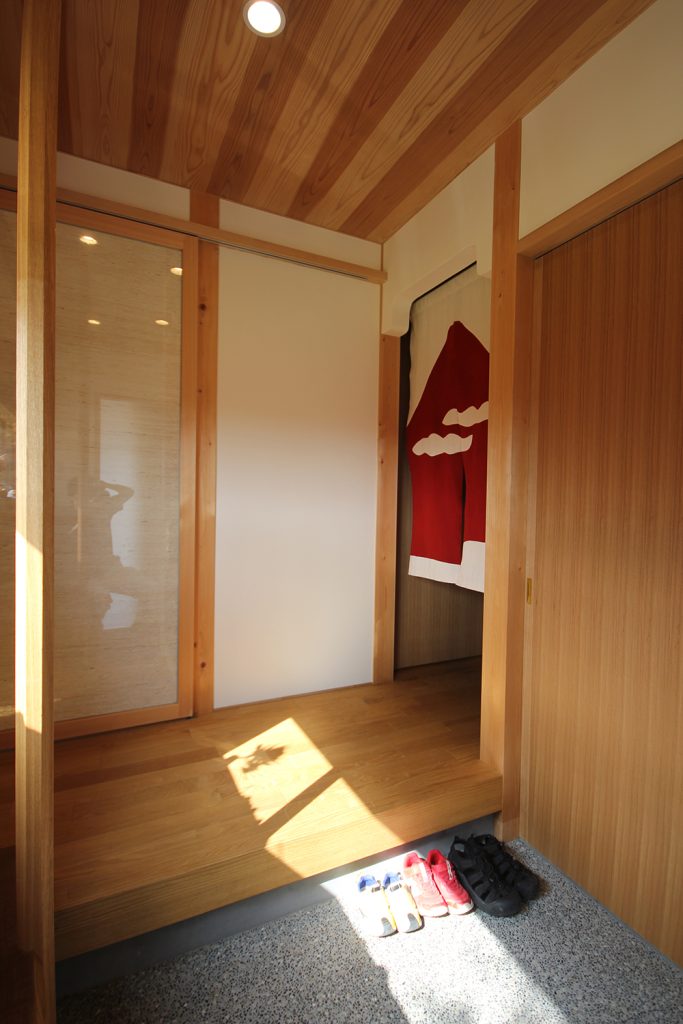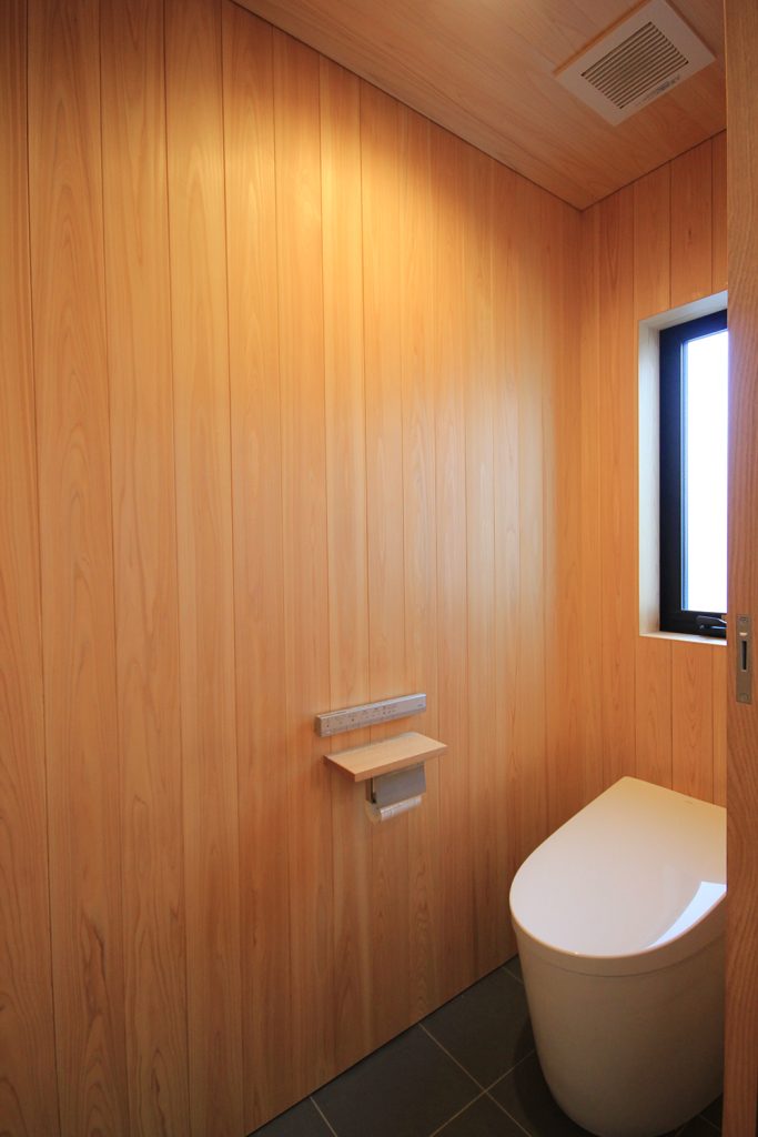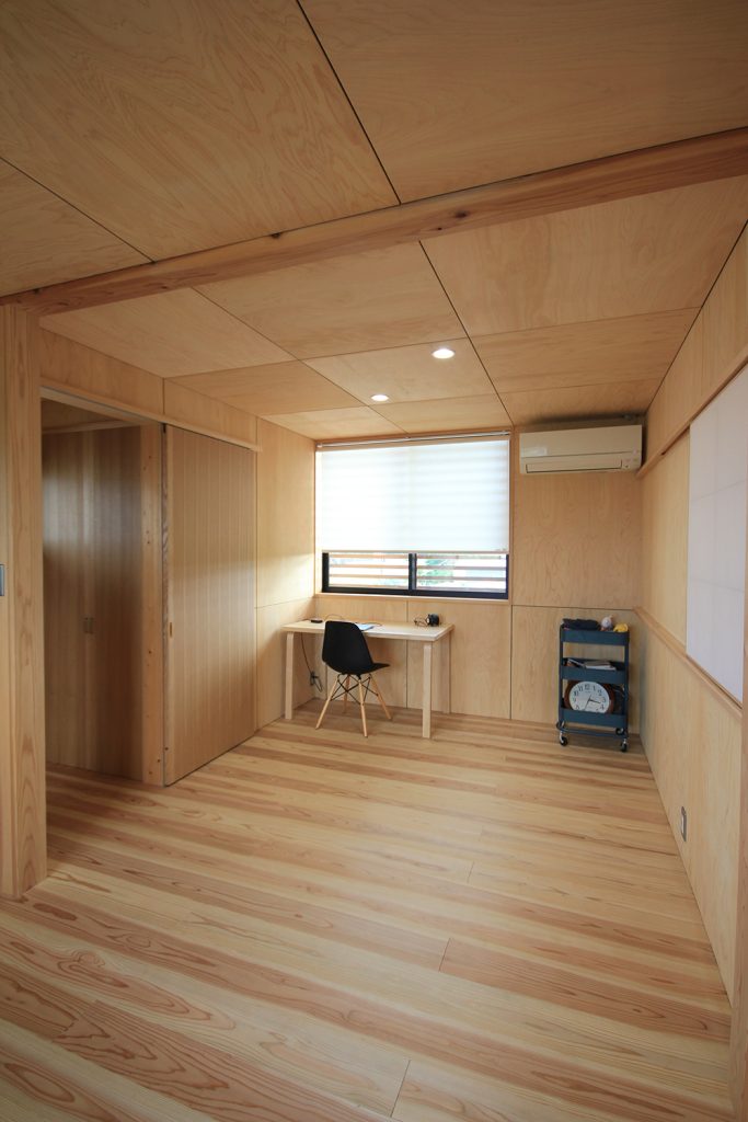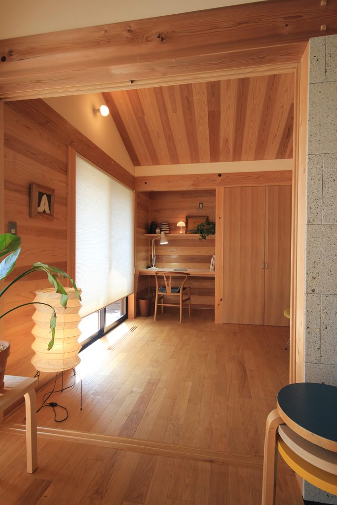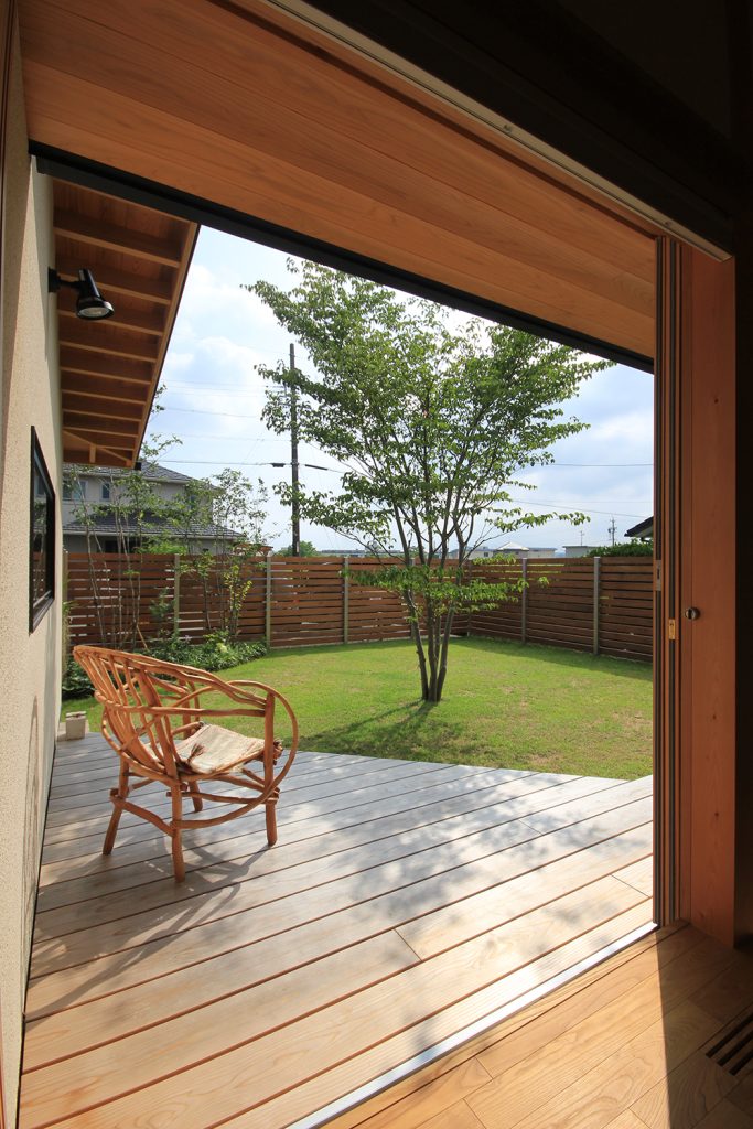 内部は、なるべく平屋で暮らせる間取りを優先的に考え、現在の4人生活を考えつつも、将来の夫婦2人生活を想定し必要なスペースを考えていきました。家族の集まる広間スペースを建物中心に、南と北の庭のどちらにもつながる窓を設けました。南の窓は家の中からもデッキを通じて植栽が楽しめます。北の窓は、薪を運んだり、家庭菜園へ出入りなど生活動線を重視してしました。