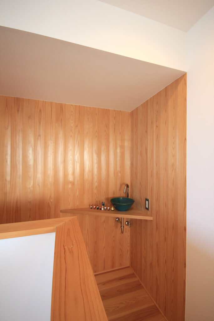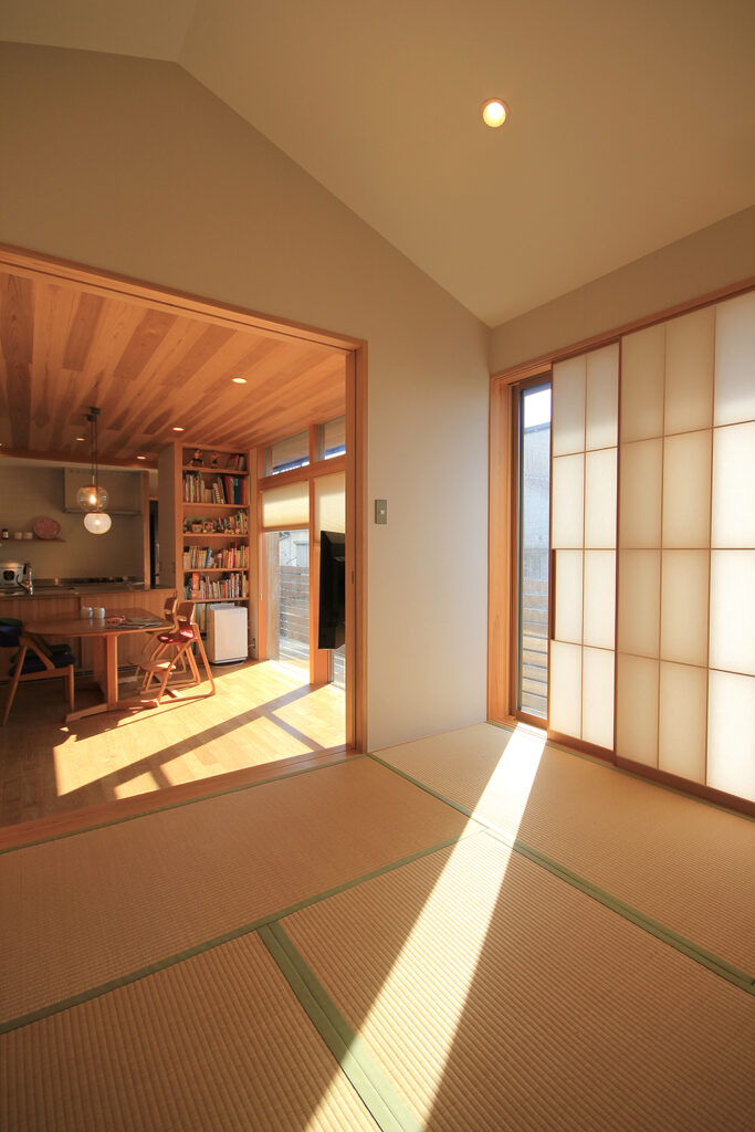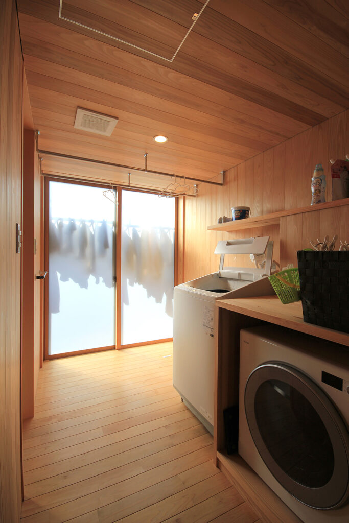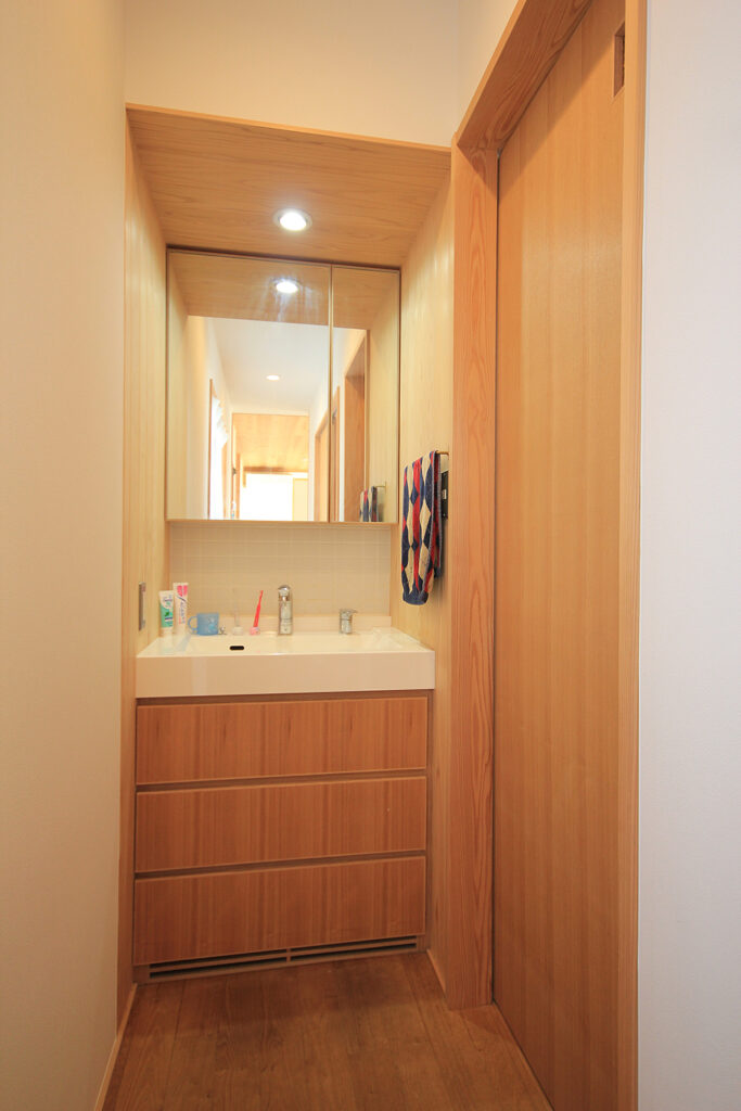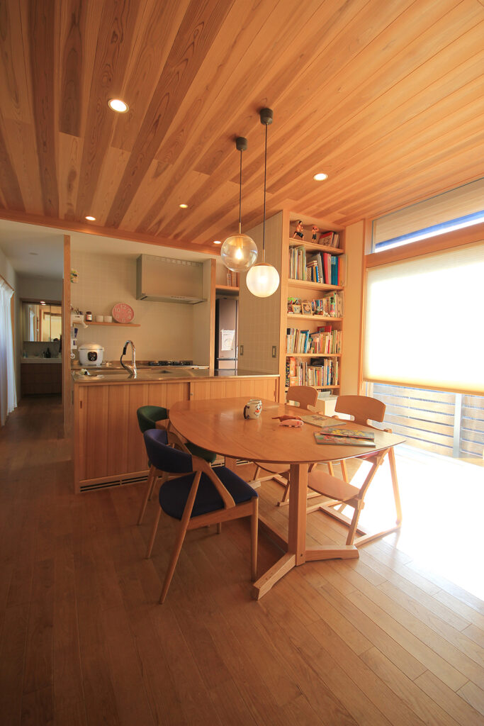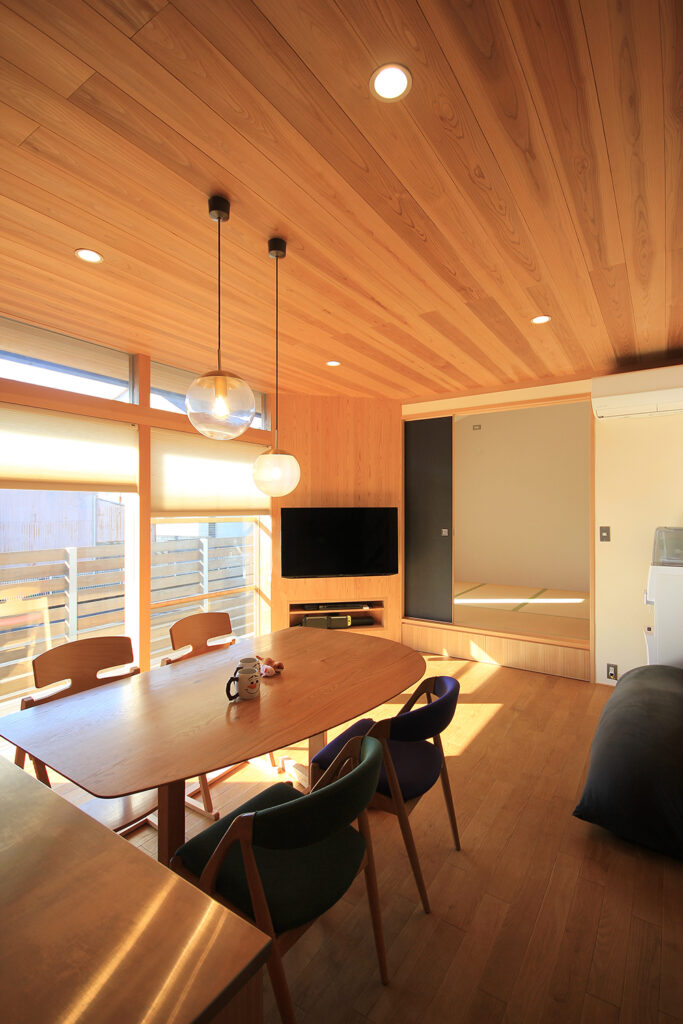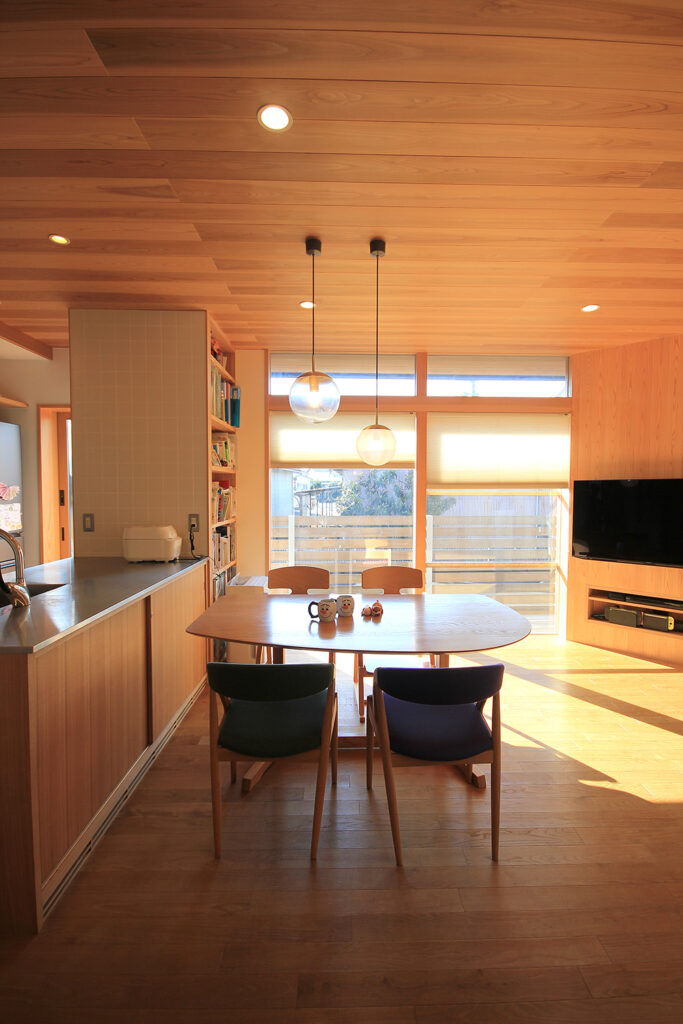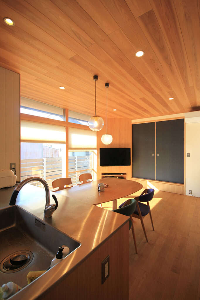 Nさんのお宅の大きな特徴は、南面にほとんどの部屋が並んだプランです。キッチンやダイニング、和室をはじめ、浴室や脱衣室も南に面して配置されています。どの部屋も日当たりが良く、明るさや暖かさと共に洗濯などの家事においてもストレスの少ないプランになりました。これらのプランを可能にしたのは土地形状のおかげで、東西に長い長方形の形状と、敷地の南面に近くのアパートの駐車場がある事が利点になりました。最近の住宅では、窓が少なく、窓の大きさも小さな家が増えてきたように思います。これは、断熱性能を重視するあまり窓の大きさを欠点として捉え、極力窓面積を小さく設計している事にあると思います。しかし、窓は欠点ではなくむしろ利点が多く、冬の暖かな日差しや部屋の明るさの確保、殺菌効果や水廻りなどの乾燥も期待できます。何より、明るく暖かい部屋である事が気分を上げ、1日の活力にもなります。Nさんのお宅に伺った日も窓から日差しがたくさん入っていました。