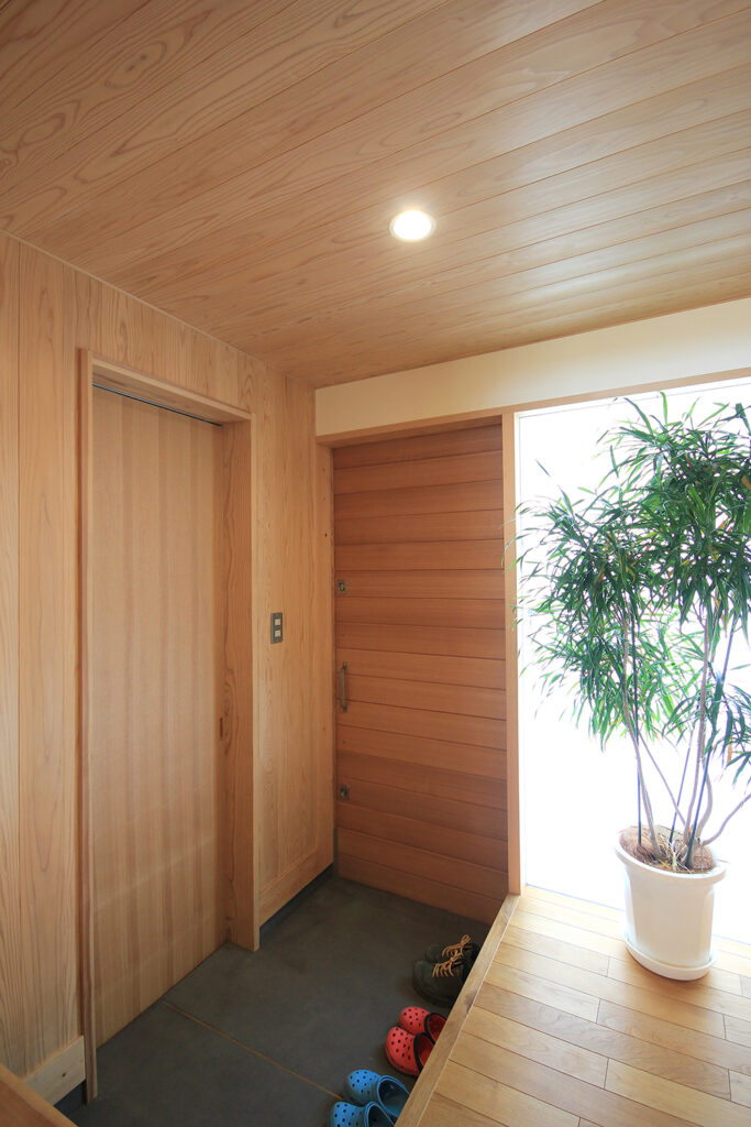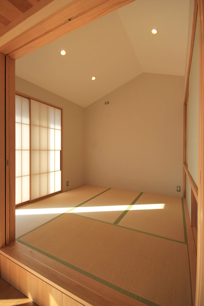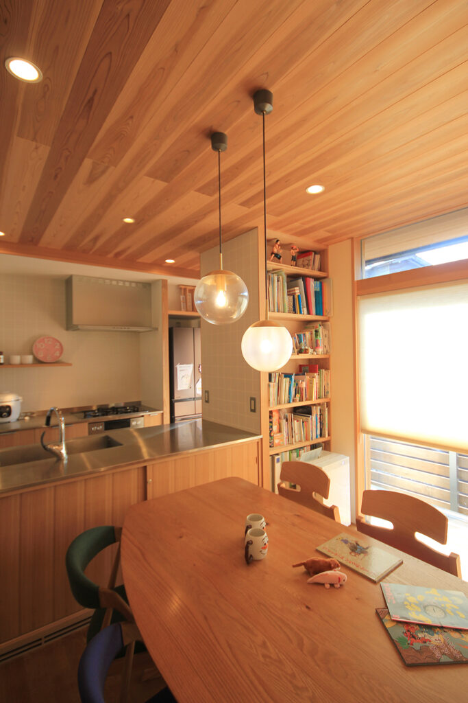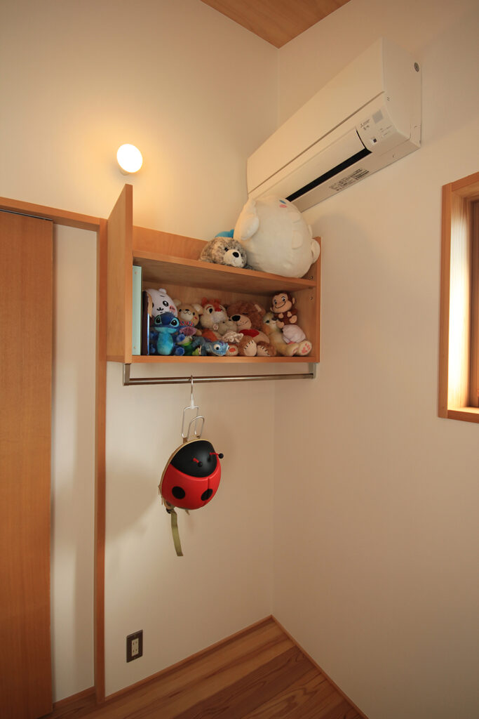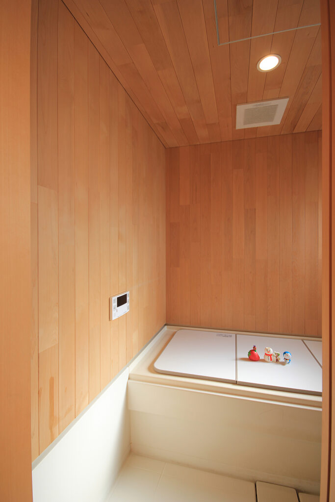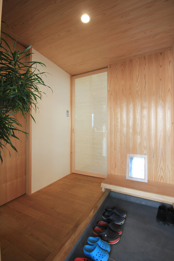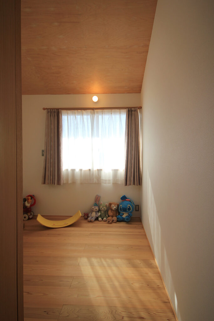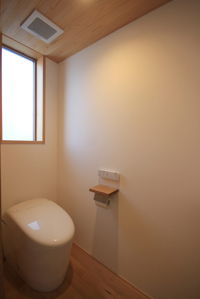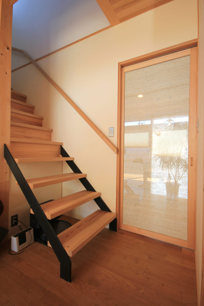 Nさんのお宅の大きな特徴は、南面にほとんどの部屋が並んだプランです。キッチンやダイニング、和室をはじめ、浴室や脱衣室も南に面して配置されています。どの部屋も日当たりが良く、明るさや暖かさと共に洗濯などの家事においてもストレスの少ないプランになりました。これらのプランを可能にしたのは土地形状のおかげで、東西に長い長方形の形状と、敷地の南面に近くのアパートの駐車場がある事が利点になりました。最近の住宅では、窓が少なく、窓の大きさも小さな家が増えてきたように思います。これは、断熱性能を重視するあまり窓の大きさを欠点として捉え、極力窓面積を小さく設計している事にあると思います。しかし、窓は欠点ではなくむしろ利点が多く、冬の暖かな日差しや部屋の明るさの確保、殺菌効果や水廻りなどの乾燥も期待できます。何より、明るく暖かい部屋である事が気分を上げ、1日の活力にもなります。Nさんのお宅に伺った日も窓から日差しがたくさん入っていました。