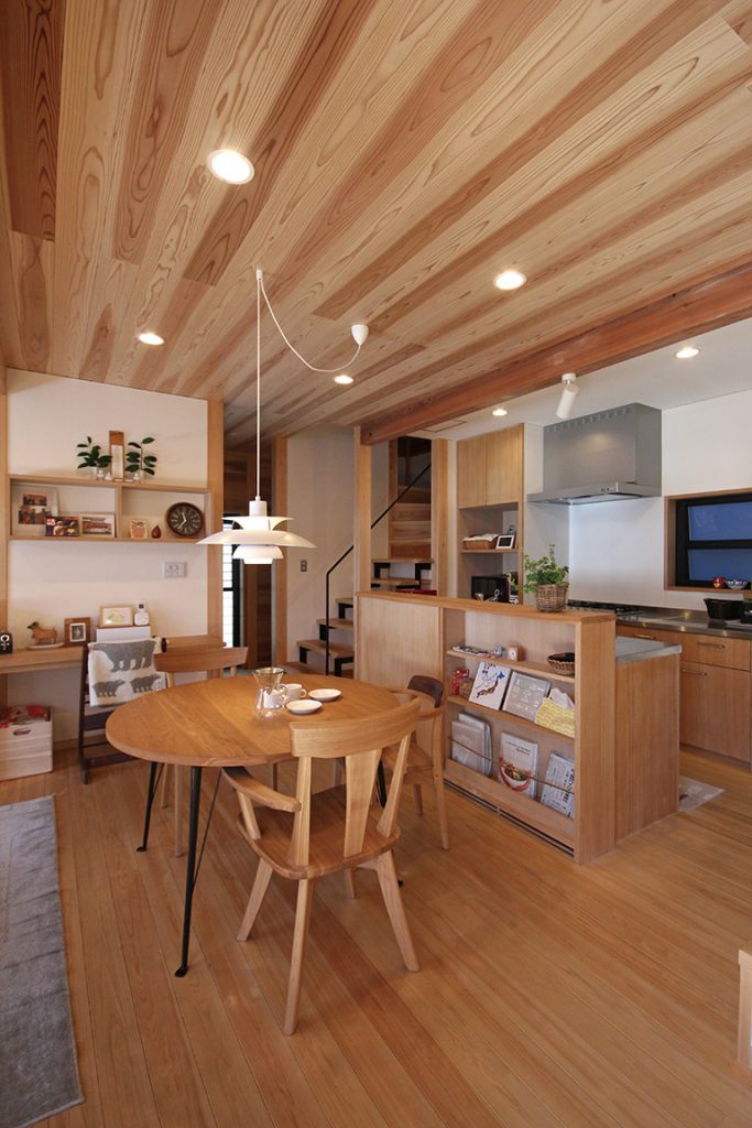 木の家は四季を通して変化し、季節を受け入れて暮らす家だと感じています。特に春は、朝の日差しから昼の日向ぼっこ、少し肌寒い夜も家の中で暖かさを感じ、木の家で過ごす至福の時を感じることができます。静岡市の住宅街に建築された「結の家」は、内部だけでなく外部も木材をふんだんに現したお宅で、1階は玄関と水回り以外ほぼワンルーム、2階はプライベートな部屋に加え室内に物干スペースを設けた間取りになっています。明るく暖かな雰囲気と共に、コンパクトで機能的な間取りをご紹介いたします。